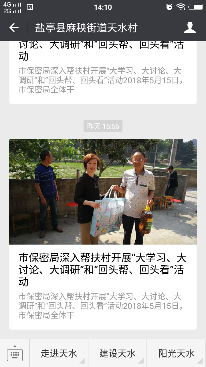 全村幅員面積3.4平方公里,耕地943畝、林地2950畝。轄9個村民小組,2017年底,共有426戶1057人。2014年被確定為省定貧困村,全村建檔立卡貧困戶63戶151人,貧困發(fā)生率達14.3%。2014年至今,在綿陽市環(huán)境保護局、綿陽市保密局、鹽亭縣環(huán)境保護局等部門的對口幫扶下,天水村聚焦“算得攏的收入、看得到的變化、靠得住的保障、掙得到的能力、信得過的認可”分戶施策,精準發(fā)力,充分運用好各項扶持政策,按照“六個精準”“五個一批”的總體要求,圍繞“一水二路三產(chǎn)業(yè)”的脫貧思路,在基礎(chǔ)設(shè)施建設(shè)、產(chǎn)業(yè)發(fā)展、公共配套設(shè)施的提檔升級,在群眾增收上找路子,在產(chǎn)業(yè)發(fā)展中求突破,措施得力,成效明顯,2017年底成功摘帽,實現(xiàn)整村脫貧。